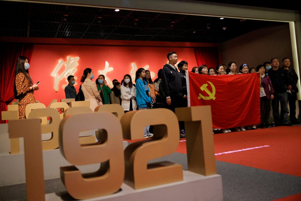 在北京的一場展覽會上,人們手持中國共產黨旗幟拍攝團體照,藉此慶祝中國共產黨成立滿百年。