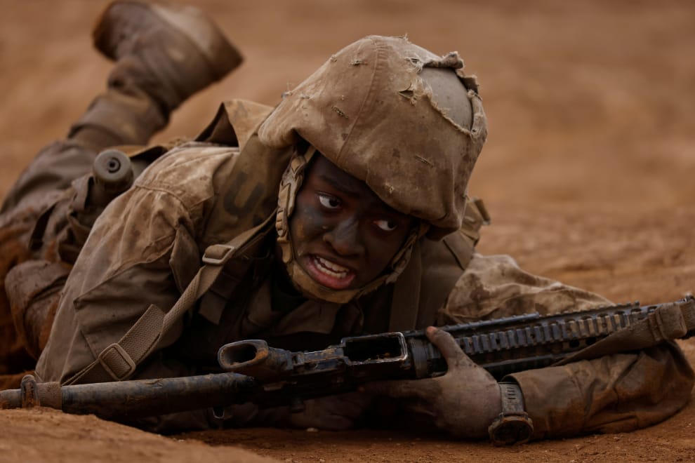 在位於加州的彭德頓營海軍陸戰隊基地(Marine Corps Base Camp Pendleton),一名女兵正在參加嚴苛的訓練。