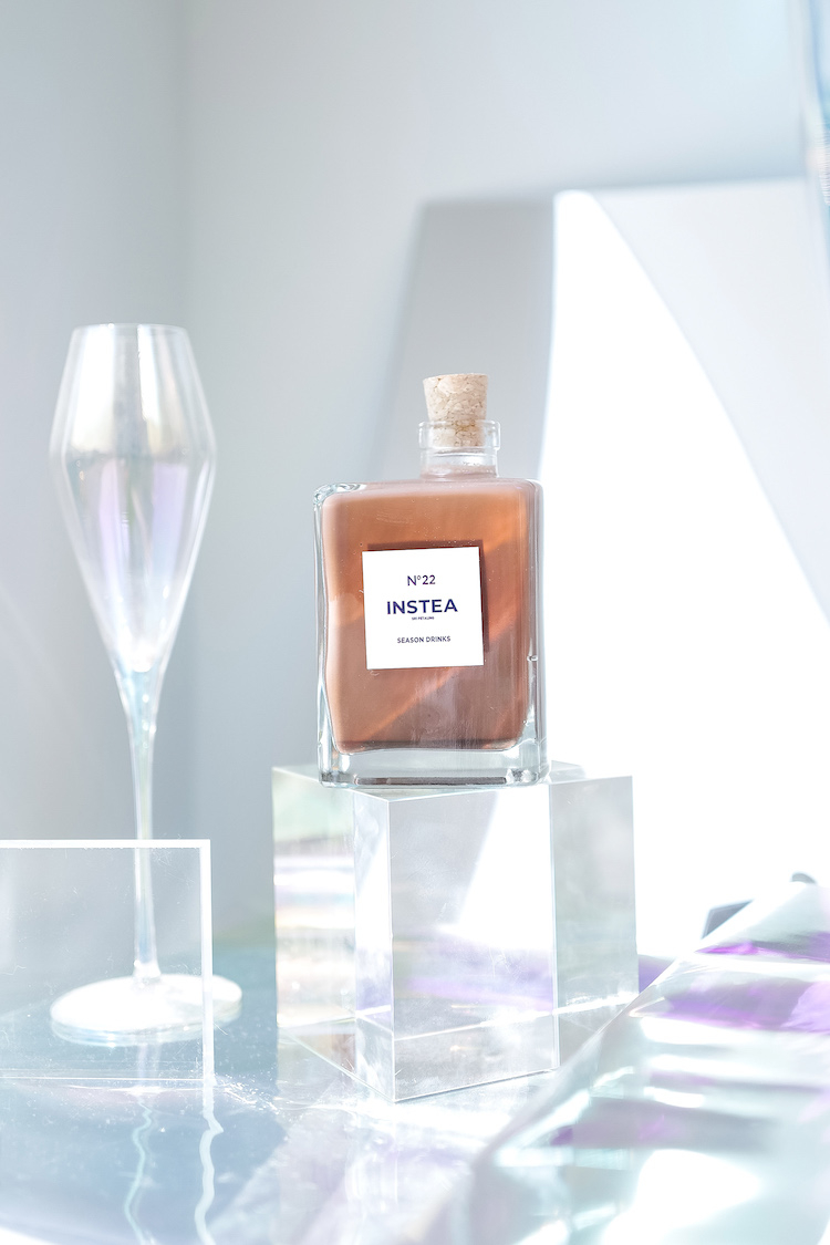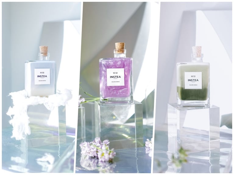 隨著居家咖啡館成為去年的日常生活風景之一,墨爾本市內的INSTEA 決定為居家泡沫紅茶注入更多時尚的女人味——隆重推出限量款「香奈兒奶茶」!這個包裝靈感來自香奈兒No.5香水瓶,四方形透明玻璃剛好可以完美呈現奶茶或花茶的顏色,而且是顧客可以重複使用的環保瓶。此香奈兒瓶裝系列稱為「Remember Me 」(勿忘我),官網的視覺特寫不僅像百貨公司展示櫃裡的高級香水,更可媲美時尚雜誌的廣告頁。換個角度,此系列的顏色呈現就像靈性彩油一樣,比如抹茶拿鐵中白色鮮奶清楚地浮在綠色抹茶上方,白綠之間隔著一道明顯的分界曲線。而「赤絲」(紅玫瑰奶茶)與「藍絲」(蝶豆花奶茶)的顏色則相反,由上方的紅或藍往下轉為白,色調相對更朦朧、浪漫。另一瓶看起來完全不像茶飲的「銀河」,則是調配蝶豆花與檸檬蜜所呈現出來的粉亮銀白,像極了剪裁一段極光入瓶。