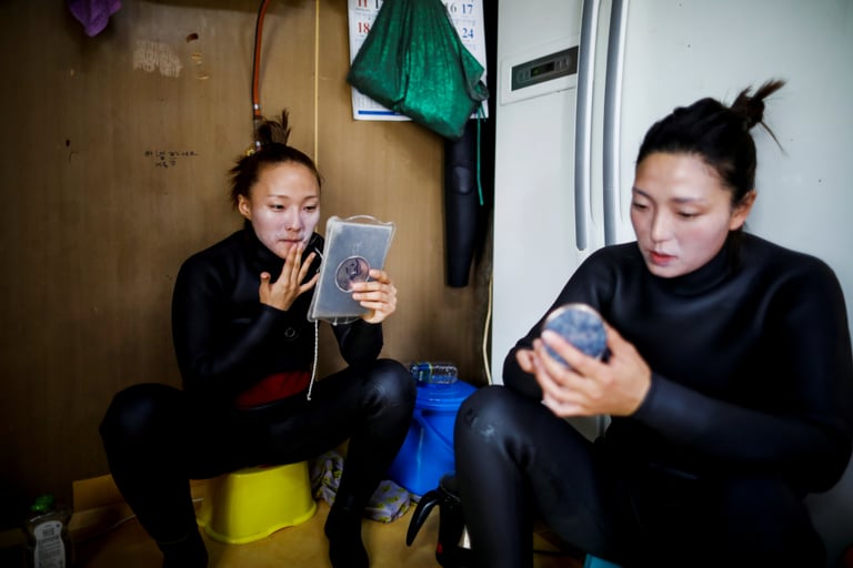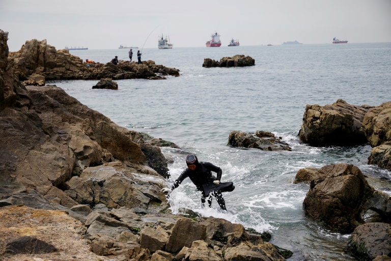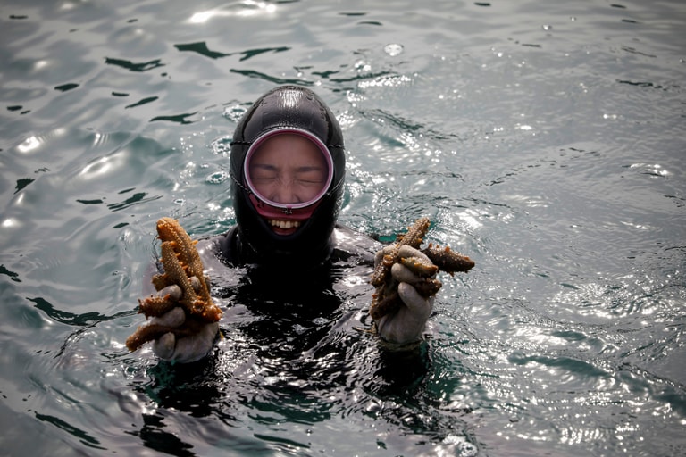 將自己包裹在黑色潛水服,戴著粉色面具,28歲的陳昭熙(Jin So-hee,音譯)突然鑽入藍綠色的海中,她的身影隨著蛙鞋消失在水面上,但一分半後,她再次從海裡竄出來,戴著手套的雙手拿著六個還七個海參,牠們背上的棘刺在晴朗的陽光下閃閃發亮。