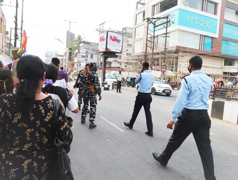 在4公里長的遊行路途中,參加的民眾一路上用英語、印地語、阿薩姆語、孟加拉語應和著宣傳車上所放送出來的口號。謹守紀律的兩列人龍與機車、三輪車、公車、小客車等各式車輛分享古瓦哈蒂繁忙的馬路,軍警注意著不讓車輛碰撞到遊行隊伍,主辦單位則時時提醒遊行者不要影響交通。這或許是同志族群最能夠公開享受公共空間的時刻之一,在這個兩年半前同性性行為仍被視為罪行的國家,驕傲遊行是個難得的解放時刻,解放社會套在性別認同上的枷鎖,並爭取自身的存在感與存在權。 阿薩姆邦在2014年舉行第一次驕傲遊行,這也是印度東北地區的首次同志遊行,同運支持者之所以在這一年決定勇敢走上街頭,是為了抗議前一(2013)年印度最高法院所做出的「開倒車」判決,該法院推翻德里高等法院2009年判定將同性性行為定罪的印度《刑法》第377條違憲的決定,認定該條款仍然有效。