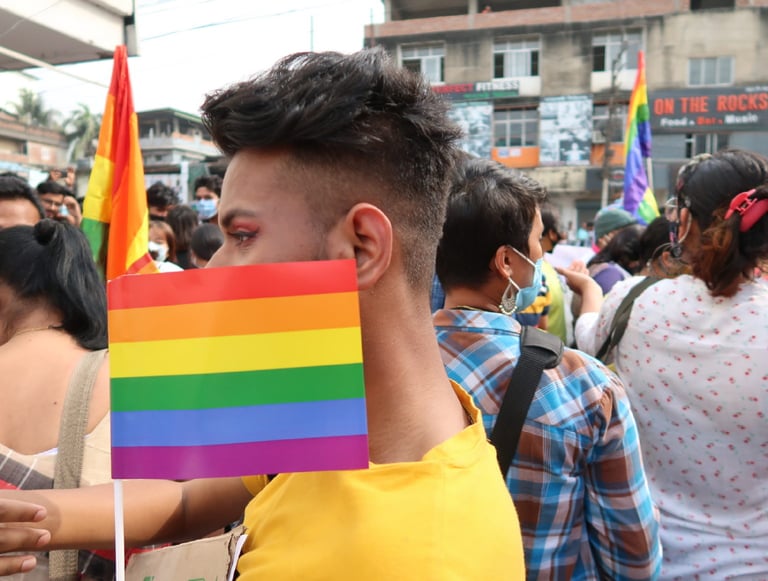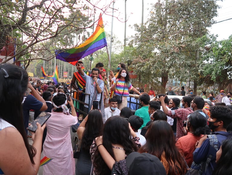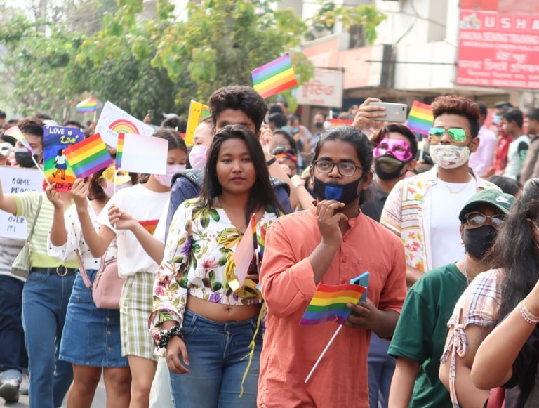 三月底一個晴朗的春日下午,數百名同志運動的支持者集結在古瓦哈蒂(印度東北地區最大城市,位於阿薩姆邦)市區的Anuradha電影院門口,歡樂地寒暄、等候,看著亮眼的扮裝皇后穿梭在裝飾著各式彩虹標誌的人群之中。在活動召集人宣讀過今年的訴求與遊行注意事項後,大家迅速地分發寫有標語的紙板(Love is love; welcome to the revolution; love has no gender…)、攤開彩虹旗,排成兩行,在Happy Pride的歡呼聲中,在第二波新冠疫情爆發的陰影下,將口罩戴好戴滿,踏出了第8屆阿薩姆彩虹遊行的腳步。