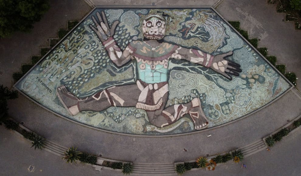 在墨西哥市的市立水系統站,由上往下俯瞰可以看到墨西哥著名畫家里維拉(Diego Rivera,1886-1957)的作品——一處以阿茲提克雨神特拉洛克(Tlaloc)為主角的噴泉。