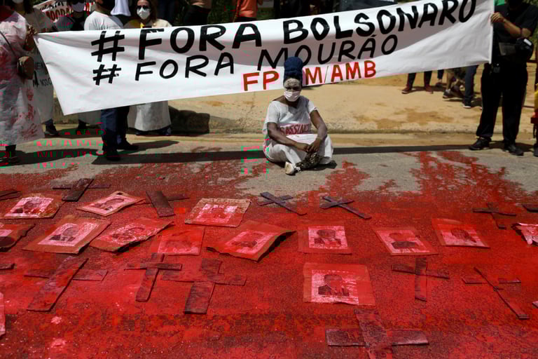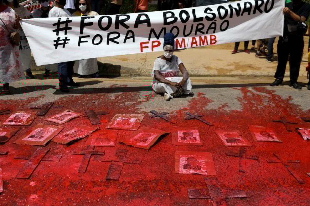 在亞馬遜州首府瑪瑙斯(Manaus),不滿政府防疫不利的民眾將政治人物的肖像泡在象徵鮮血的紅色墨水中,並且要求巴西總統波梭奈羅(Jair Bolsonaro)下台。