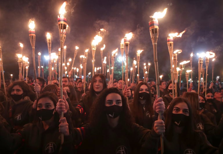 在首都葉里溫(Yerevan),民眾高舉著火炬,悼念亞美尼亞的大屠殺紀念日(Armenia's Genocide Remembrance Day),每年到了這個時候,都會有大批民眾走上街頭哀悼鄂圖曼土耳其帝國(Ottoman Turks)於 1915-1917年間迫害境內 150萬名亞美尼亞人的悲劇。