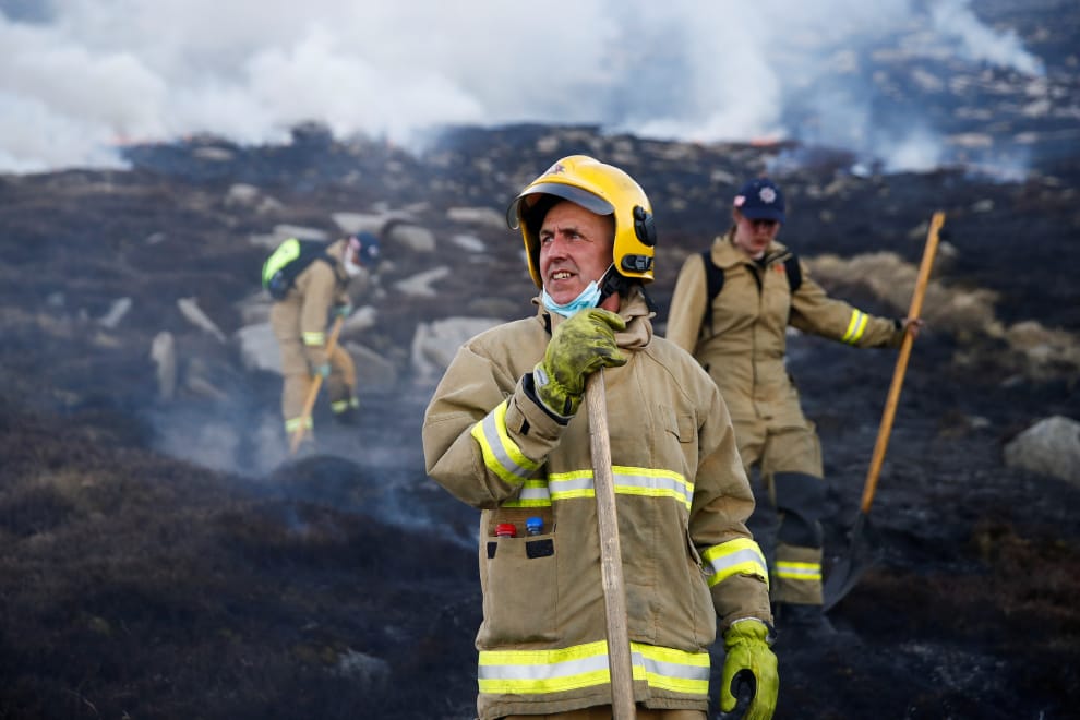 在北愛爾蘭的蒙恩山脈(Mourne Mountains),消防員正在撲滅一場森林大火。