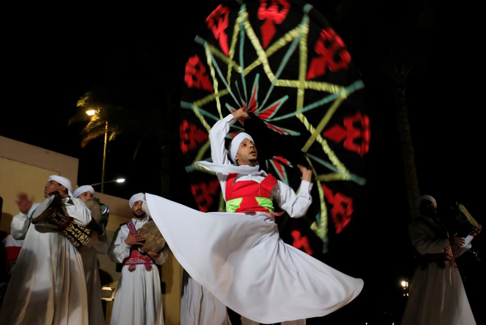 在首都開羅,一名舞者穿著白色的服裝表演蘇菲旋轉舞(Sufi whirling),這是伊斯蘭蘇菲(Sufi)教派的僧人儀式,他們透過不斷旋轉進入冥想狀態,藉此和真主阿拉溝通。
