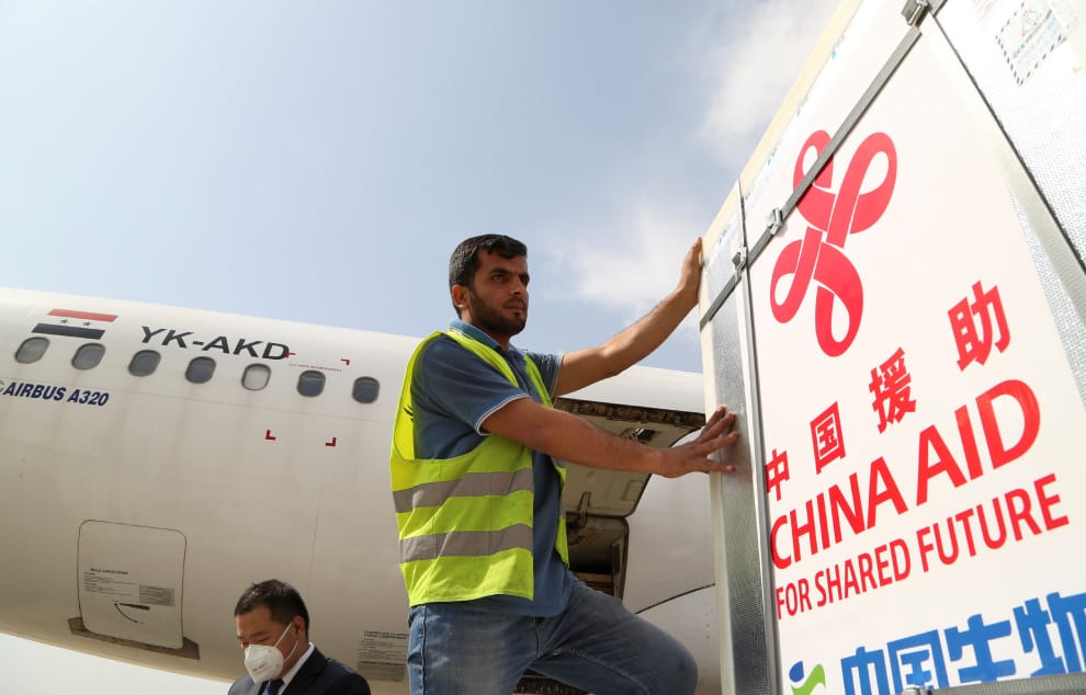 在首都大馬士革的機場內,工作人員正在將一批批來自中國國藥集團製作的COVID-19(武漢肺炎)疫苗卸貨,並且感謝中國捐贈疫苗的行動。