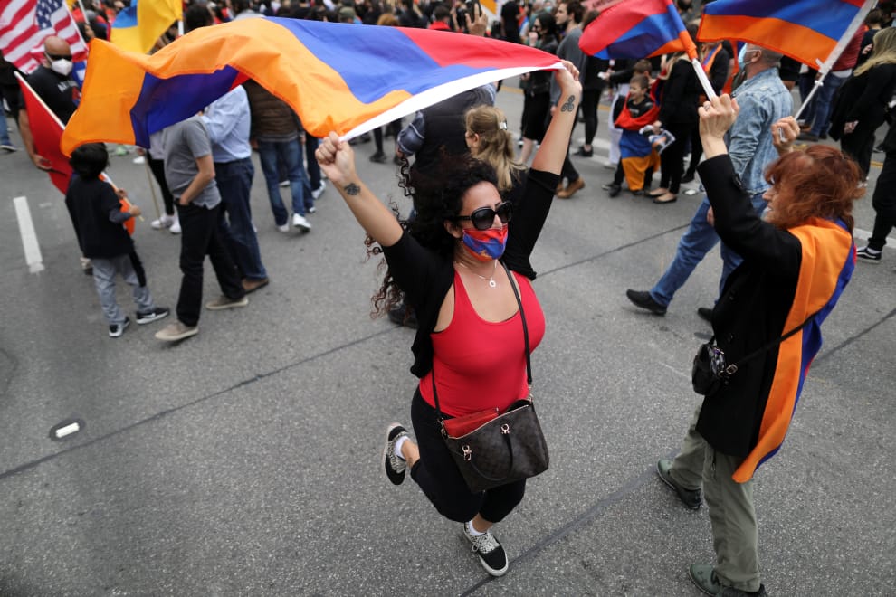 在加州洛杉磯,一名女子拉著亞美尼亞國旗在街頭奔跑,藉此悼念大屠殺紀念日(Armenia's Genocide Remembrance Day),每年到了這個時候,都會有大批民眾走上街頭哀悼鄂圖曼土耳其帝國(Ottoman Turks)於 1915-1917年間迫害境內 150萬名亞美尼亞人的悲劇。