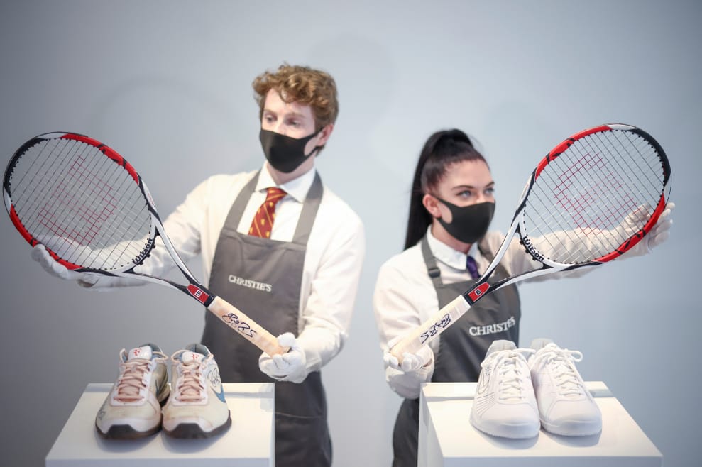 在倫敦佳士得(Christie's)拍賣行內,工作人員正在展示即將在 6月23日現場拍賣會上登場的拍賣品,這次的拍賣品由瑞士網球名將費德勒(Roger Federer)提供,每件拍賣品預估可以拍得 5萬到7萬英鎊(折台幣約 193萬-270萬元),拍得的金額將投注在他一手創立的慈善組織「費德勒基金會」(Roger Federer Foundation),用來增加瑞士和非洲孩子的教育資源。