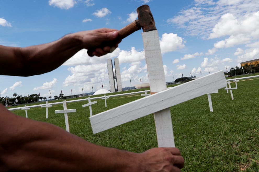 在首都巴西利亞的國會建築前,抗議民眾在草地上立起一個個十字架,每個十字架都代表一位因染疫身亡的患者,藉此抗議當局防疫不力,讓無數條人命白白犧牲。