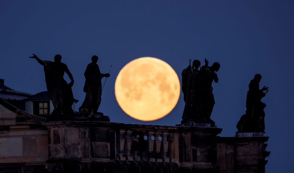 在德國薩克森自由邦(Saxony)的首府德勒斯登(Dresden),可以看到以超級月亮為背景的宮廷主教座堂。這輪超級月亮比一般可見的滿月還要大上 6%,還會在全世界引發大潮。