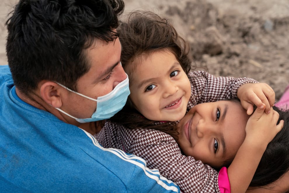 在位於美墨邊界的德州拉霍亞市(La Joya),剛剛渡過格蘭河(Rio Grande river)進入美國的移民家庭正等著被美國邊境巡邏隊送往安置處。