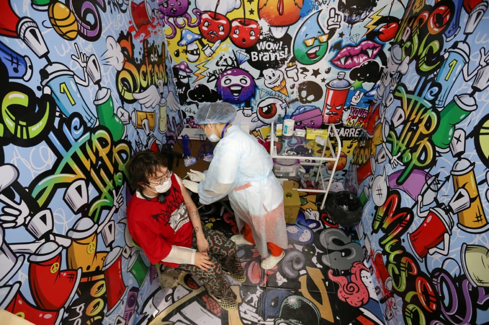 在哈薩克第一大城阿拉木圖(Almaty),一名民眾在由百貨公司改建的疫苗接種中心內接種哈薩克自己研發的COVID-19(武漢肺炎)疫苗──QazVac。