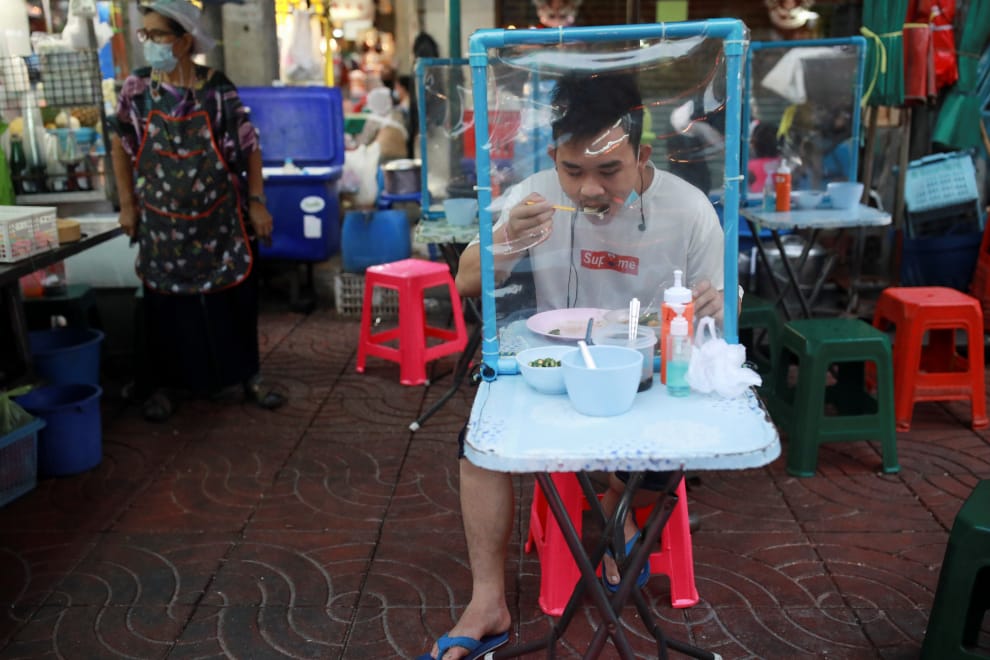 在曼谷路邊的小吃攤,一名男子坐在設有防疫隔簾的座位上大快朵頤。