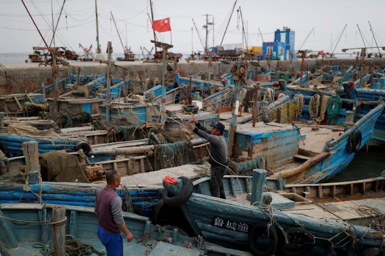 在山東省青島港,漁夫們站在停泊的船隻上整理捕魚設備。近日,載有瀝青混合油的利比亞註冊油輪「交響樂號」(A Symphony)因為大霧視線不良與一艘貨船對撞,造成將近 500噸的漏油,目前當地政府正緊鑼密鼓地清除海上油汙,他們也呼籲民眾暫時不要出海捕魚。