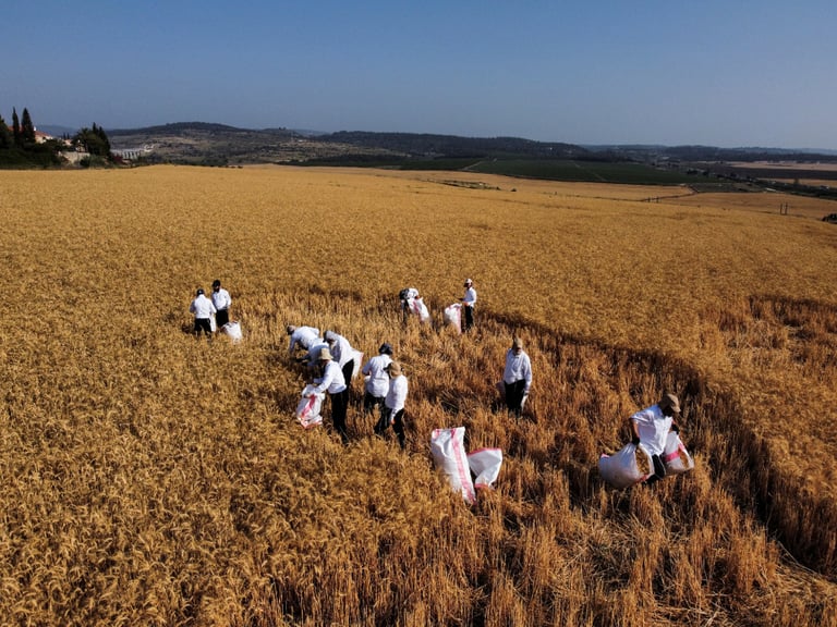 在以色列中部的猶太人居住地Nof Ayalon,人們忙著採收小麥,準備拿去做歡慶「逾越節」(Passover)的重要食物——「無酵餅」(Matza),這是一種完全無發酵、僅用麵粉和水做成的麵餅,這看似平淡無味的食品,有著深遠的紀念和象徵意義。