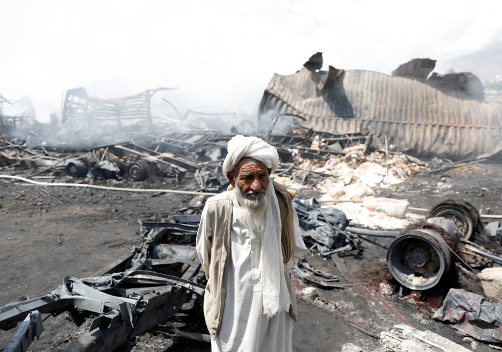 在阿富汗首都喀布爾(Kabul)市郊,現年 78歲的卡車車主穆罕默德(Dad Mohammad)一臉無奈地站在卡車、油罐車的殘骸前。