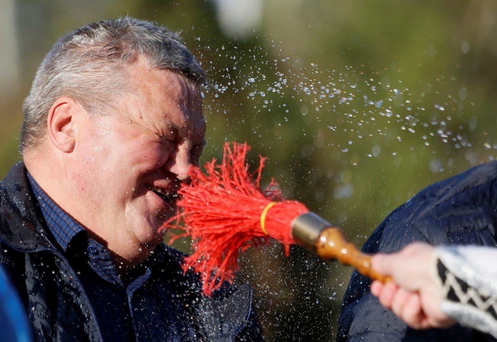 在烏克蘭東部、由分離主義者控制的頓內次克(Donetsk)地區,神聖變形大教堂(Holy Transfiguration Cathedral)的神父在東正教復活節禮拜上拿起工具,朝信徒的臉上灑聖水。
