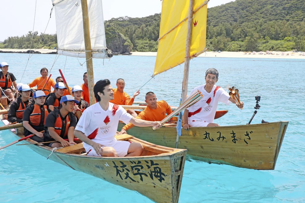 在日本沖繩縣南端的小島座間味島(Zamami)外海,負責傳遞奧運聖火的選手將聖火從一艘小船傳到另外一艘小船上。