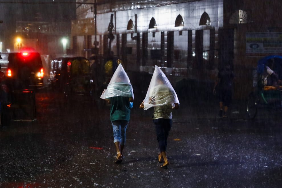 在孟加拉首都達卡(Dhaka),兩名路人用塑膠袋套住上半身,匆匆走在下著大雨的夜晚裡。