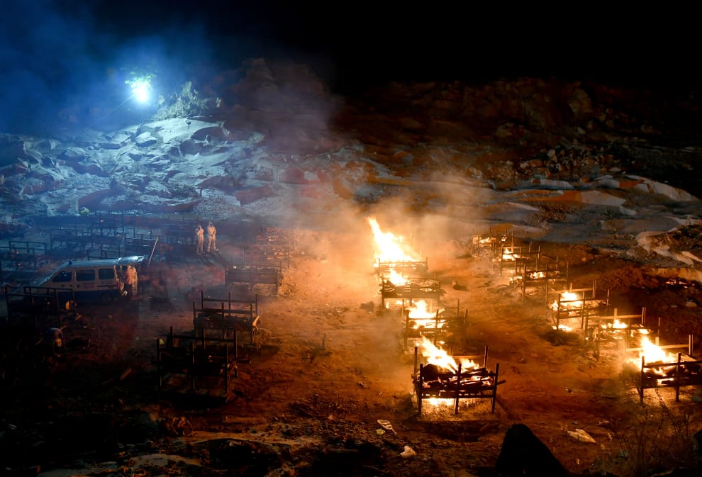 在印度第三大城邦加羅爾(Bengaluru)的吉德納哈利村(Giddenahalli village),志工們站在一處臨時火葬場旁邊的空地,望著眼前一座座專門用來焚燒COVID-19(武漢肺炎)死者遺體的露天火爐。