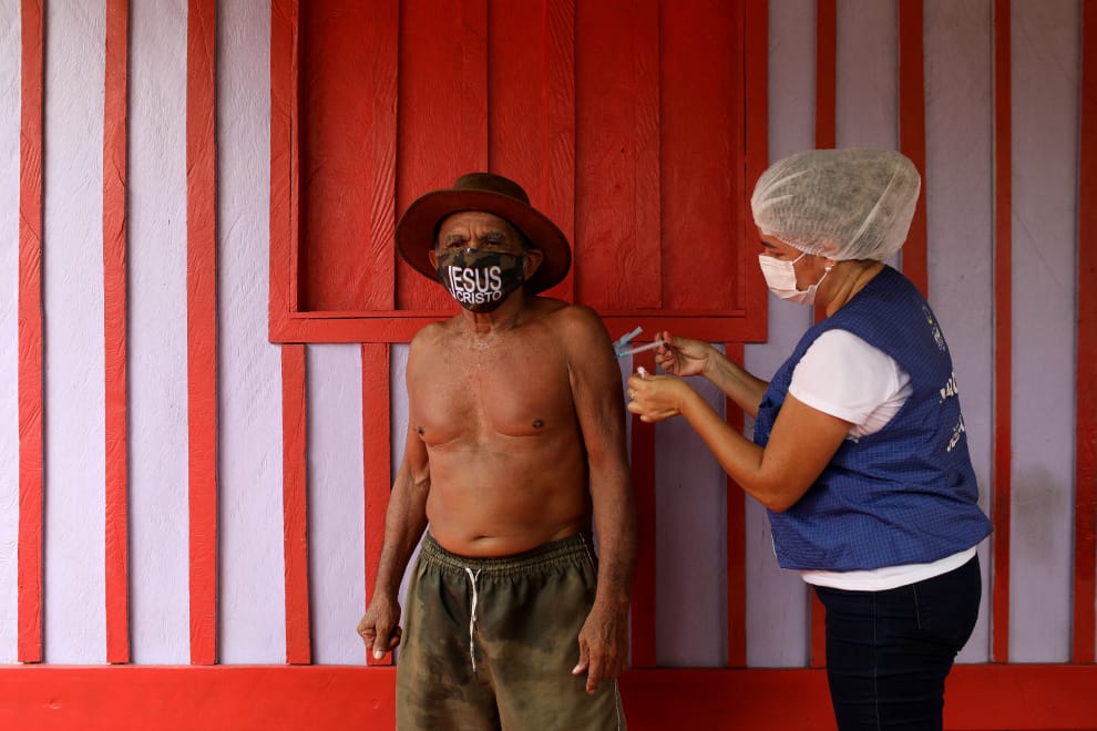 在巴西位於亞馬遜雨林中間的城市瑪瑙斯(Manaus),市政府的公衛人員德利馬(Ana Cassia Oliveira de Lima)在COVID-19(武漢肺炎)疫情蔓延期間親自到訪現年 75歲市民菲略(Joao Aquino Filho)的家,替他施打疫苗。