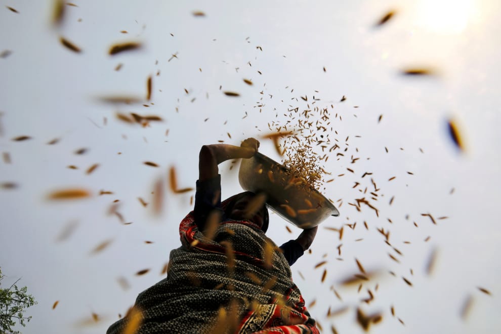 在孟加拉首都達卡(Dhaka)郊區的小鎮比魯里亞(Birulia),一名婦女從頭上頂著的鋼盆中倒出先前收成的稻米。