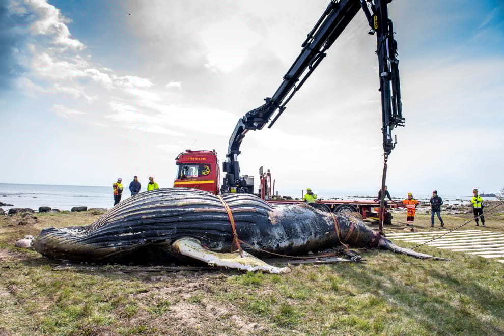 在瑞典南部厄蘭島(Oland island)的塞格斯塔德燈塔(Segerstad Lighthouse)附近,工作人員們正試圖用吊車吊起一具座頭鯨(Megaptera novaeangliae)的屍體,好送往附近的焚化設施焚化。