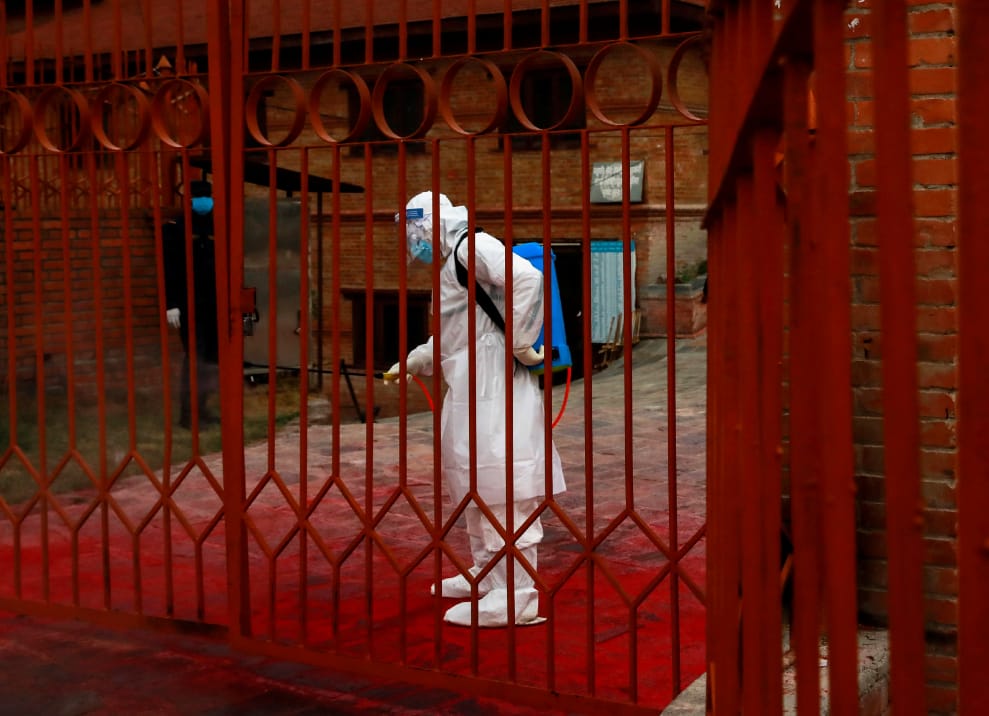在尼泊爾首都加德滿都(Kathmandu),一名身穿全套防護服的工作人員正在消毒一間曾停過COVID-19(武漢肺炎)病患遺體的火葬場。