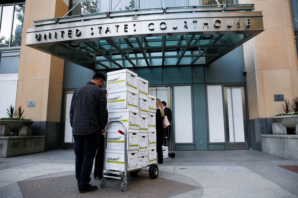 在美國加州奧克蘭市(Oakland)的奧克蘭聯邦法院外,近期這間法院即將展開美國電玩開發商Epic Games控告蘋果涉嫌獨佔的訴訟,法庭人員將一箱箱審理所需的文件送入法院。