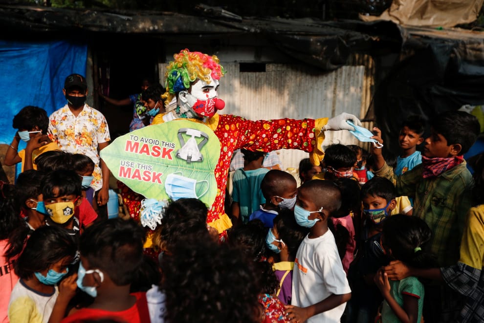 在印度大城孟買,一名男子打扮成小丑的樣子,走進孟買的貧民窟裡將口罩發送給孩子們。