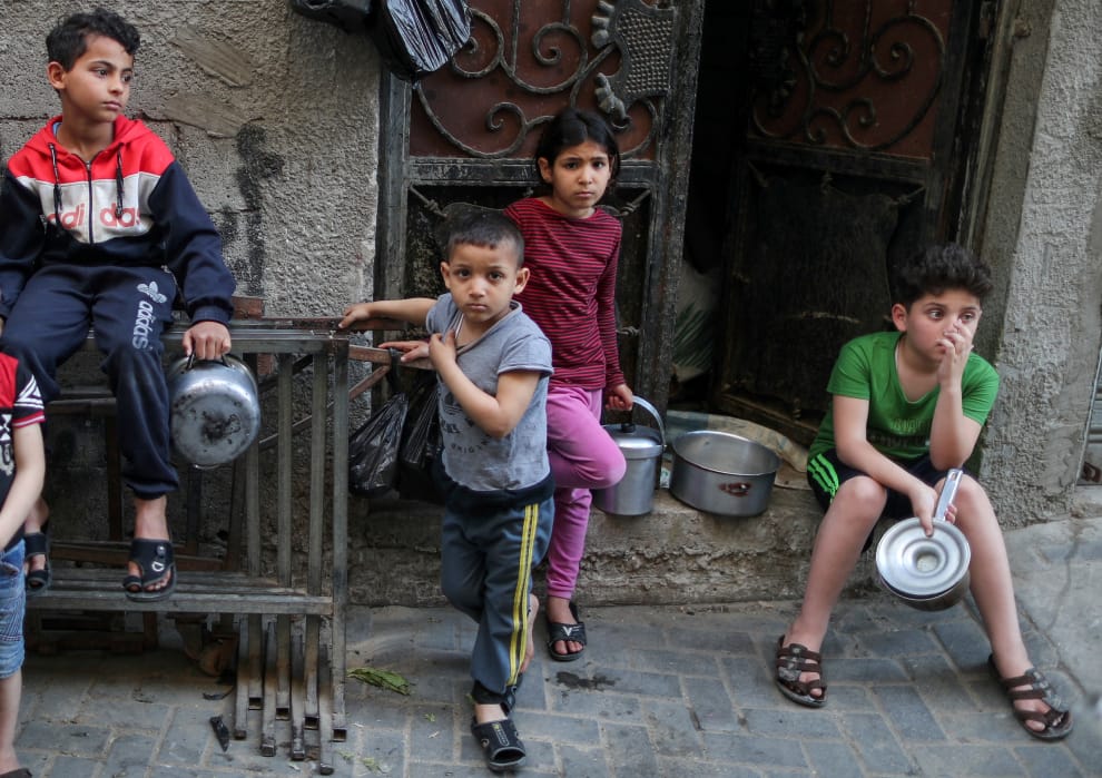 在巴勒斯坦南部的加薩市(Gaza City),孩子們拿著空容器坐在門口,等著上前領取齋戒月期間公益人士提供的免費湯品。