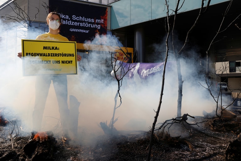 在奧地利首都維也納(Vienna),綠色和平組織(Greenpeace)的成員站在一片濃煙裡,抗議巴西亞馬遜雨林內大規模的伐木行動。