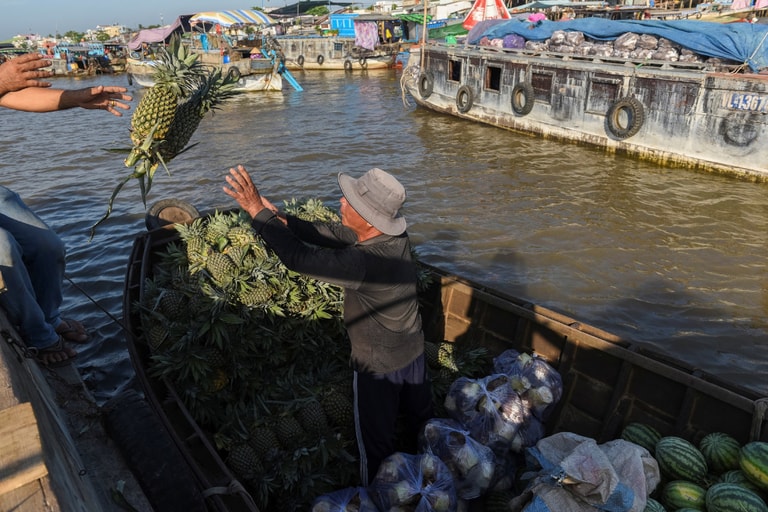 在越南第五大城芹苴市(Can Tho)湄公河(Mekong river)的蔡朗水上市場(Cai Rang floating market)上,一名賣水果的小販接過岸上人拋來的水果。