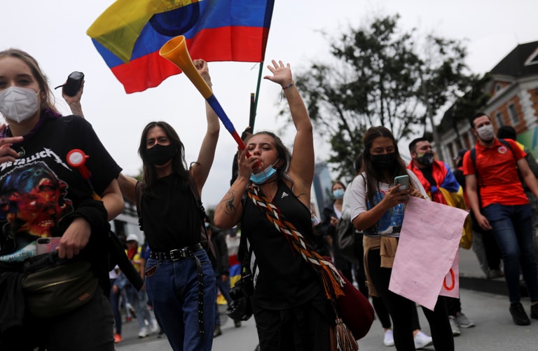 在哥倫比亞首都波哥大(Bogota),示威者拿起樂器、國旗走上街頭,針對國內的貧窮、警暴問題展開示威。
