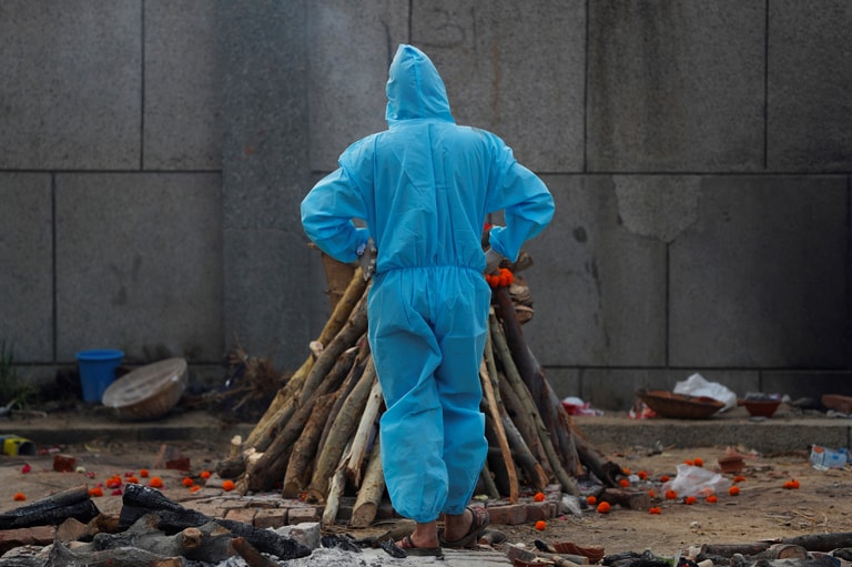 在印度首都新德里,一名身著全套防護服的男子站在一堆熊熊燃燒的火堆前,靜靜望著親戚逐漸消失在火光中的遺體。他的親戚也是當前印度新一波COVID-19(武漢肺炎)疫情下的受害者之一。