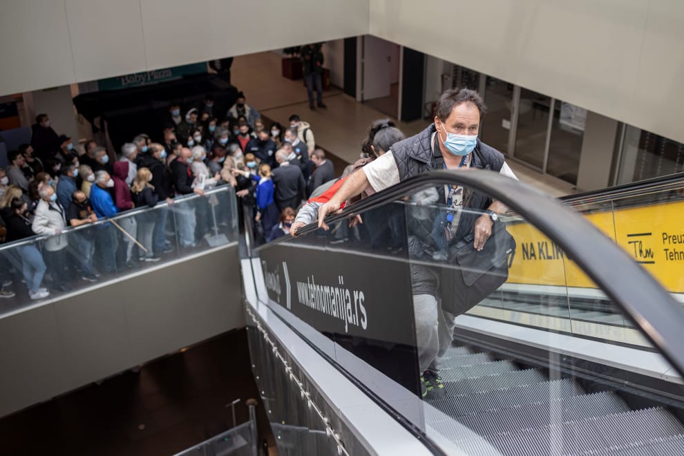 在塞爾維亞首都貝爾格萊德(Belgrade),等著接種疫苗好換取優惠的人把電扶梯口擠得水泄不通。