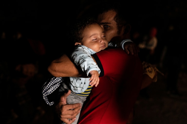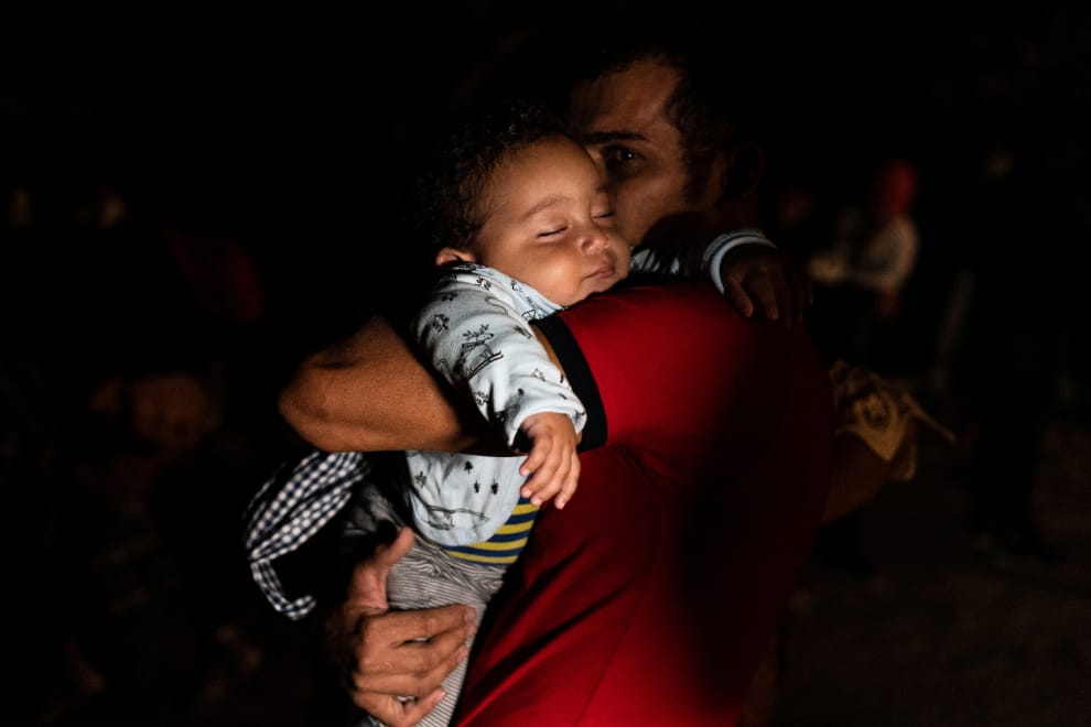 在美墨邊境的城市洛馬(Roma),一位父親緊緊抱著他熟睡中的小孩,靜靜等著美國邊境巡邏隊的隊員前來接他們。