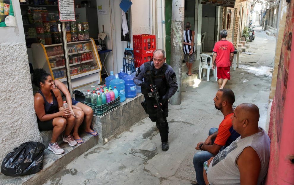 在巴西大城里約熱內盧的雅卡雷濟紐貧民窟(Jacarezinho),居民們讓出一條路給匆匆跑過的警察,好讓他能前去逮捕躲藏在街道巷弄中的毒販。