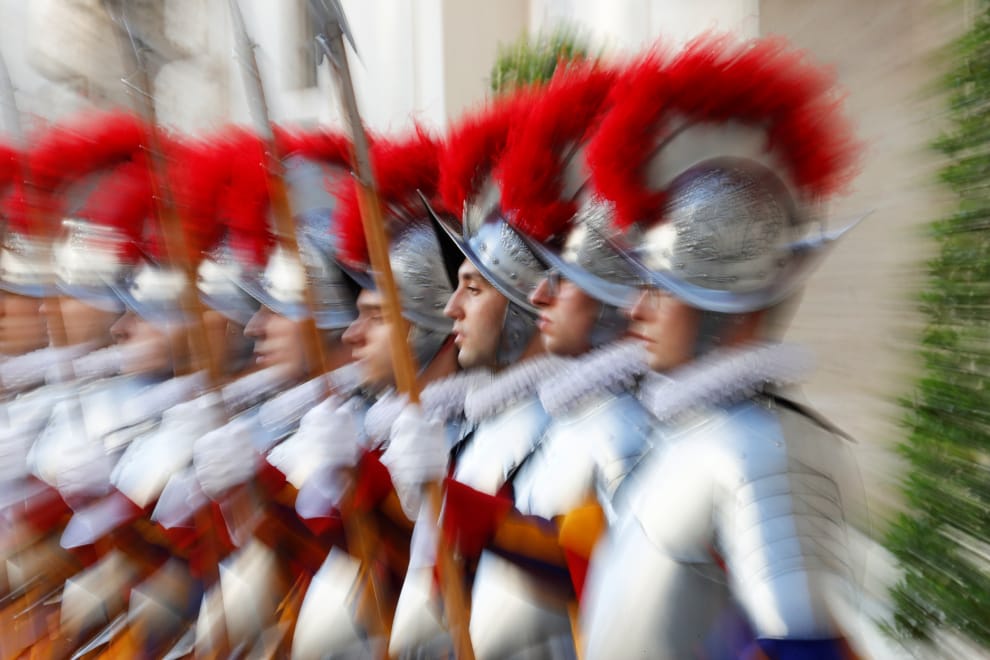 在梵蒂岡,新近的瑞士近衛隊站成一列,準備宣誓就職。