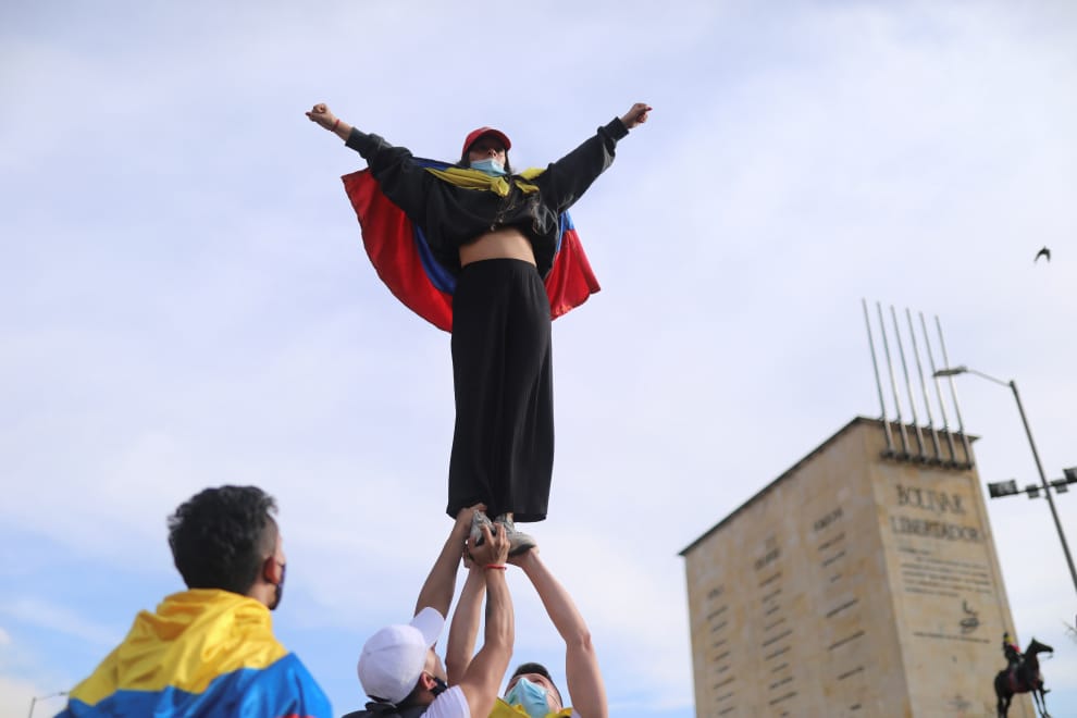 在哥倫比亞首都波哥大(Bogota)的一場反政府示威上,示威者們聯手將女孩高舉到空中。