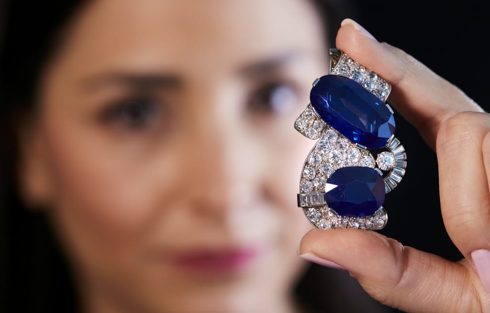 在瑞士大城日內瓦,蘇富比(Sotheby)拍賣行的員工對著鏡頭展示一枚於 1930年生產的藍寶石、鑽石胸針,要是成功拍出,上頭的藍鑽也將成為蘇富比拍賣過最大顆的藍鑽石。