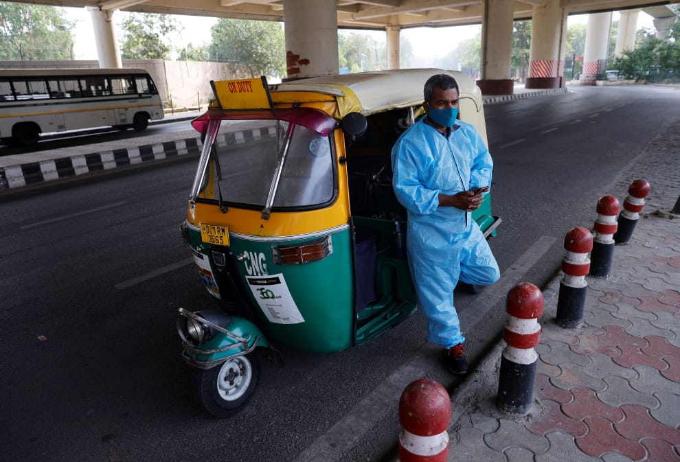 在印度首都新德里,現年 42歲的庫瑪(Raj Kumar)站在自己的嘟嘟車(rickshaw)旁等著客人上門。在COVID-19(武漢肺炎)疫情開始後,庫瑪便開著自己經改裝後的嘟嘟車,穿梭在新德里大大小小的巷弄間,免費接送有需要的病患及家屬們。
