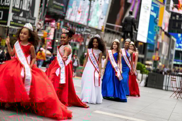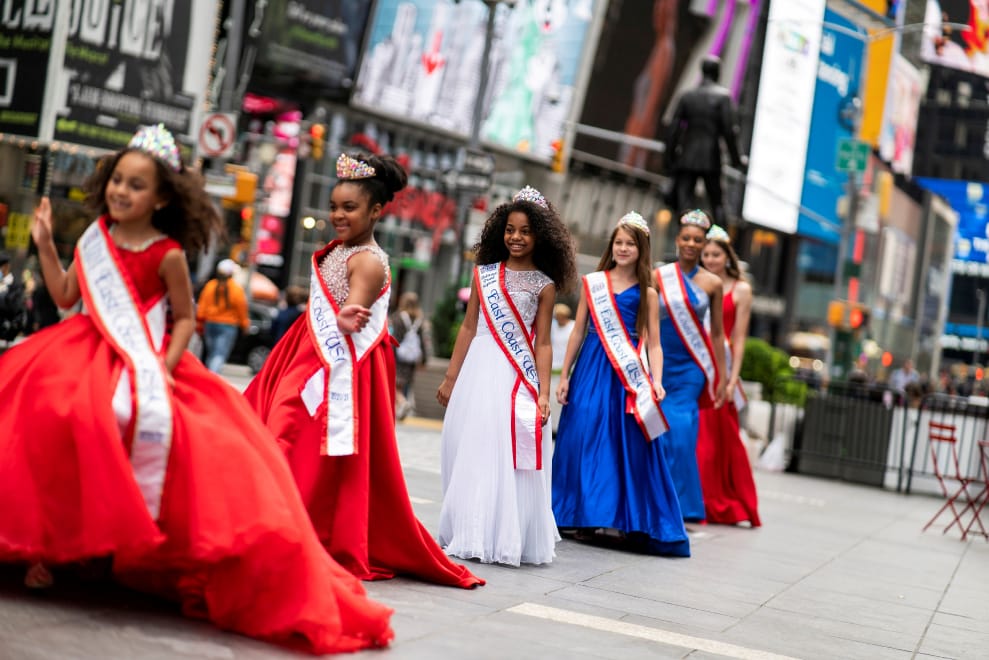 在美國紐約市的時代廣場(Times Square)上,選美小姐們在廣場上一字排開準備合照。