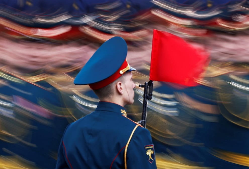 在俄國首都莫斯科,最近俄國軍方為勝利日閱兵舉行了彩排。在彩排過程中,一名帶著小紅旗的士兵出現在人潮中間。