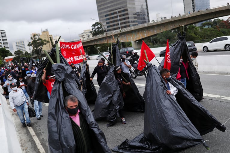 在巴西大城聖保羅,無家工人運動(Roofless Workers Movement)的示威者們舉辦遊行、堵住了馬路,要求巴西總統波梭奈羅(Jair Bolsonaro)提供他們COVID-19(武漢肺炎)疫苗和補助。