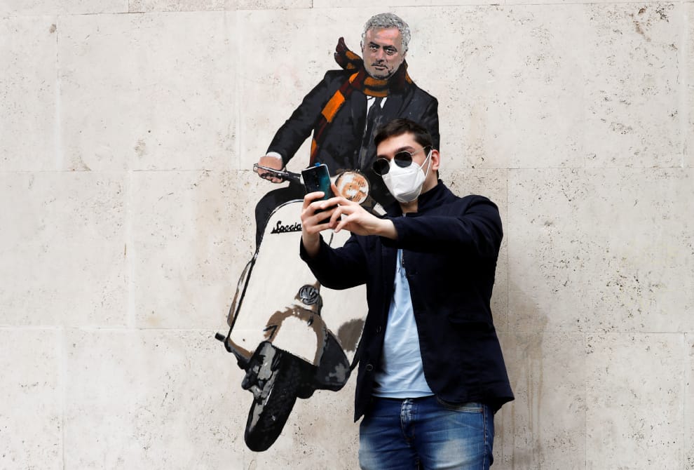 在義大利首都羅馬,一名男子與一幅新任羅馬體育俱樂部(AS Roma)總教練穆里尼奧(Jose Mourinho)騎著偉士牌(Vespa)摩托車的塗鴉合照。