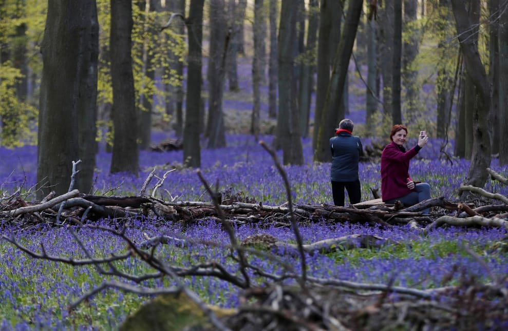 在英國哈特福郡(Hertfordshire)伯克翰斯德市(Berkhamsted)附近的多奇森林(Dockey Wood),一名女性正坐在一片開滿風鈴草的山野間拍照。