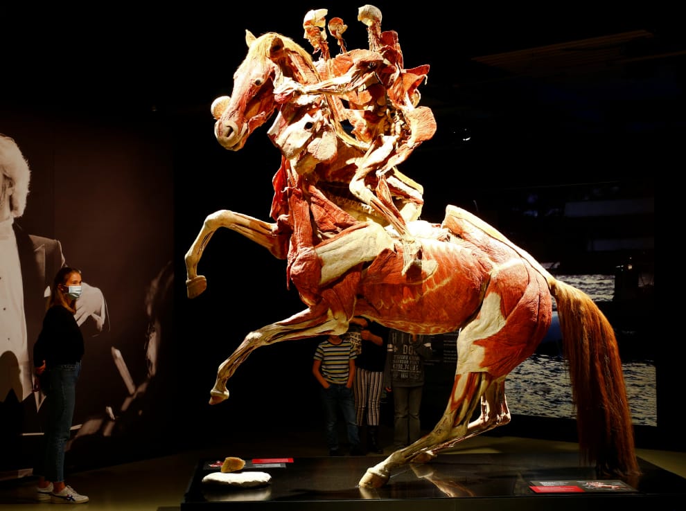 在瑞士大城市蘇黎世(Zurich),一名女子正在仔細欣賞《人體奧妙展》(Body Worlds)內一個同時呈現人、馬肌肉分布的展示品。